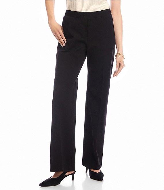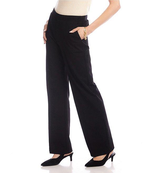 From Karen Kane Petite, these pants feature: Double stretch twill fabrication Straight leg silhouette Mid rise elastic waistband Two side functional pockets Straight hemline Pull-on construction Approx. 29" inseam; 11.125" rise Viscose/cotton/spandex Machine wash/line dry Made in the USA of imported fabric.