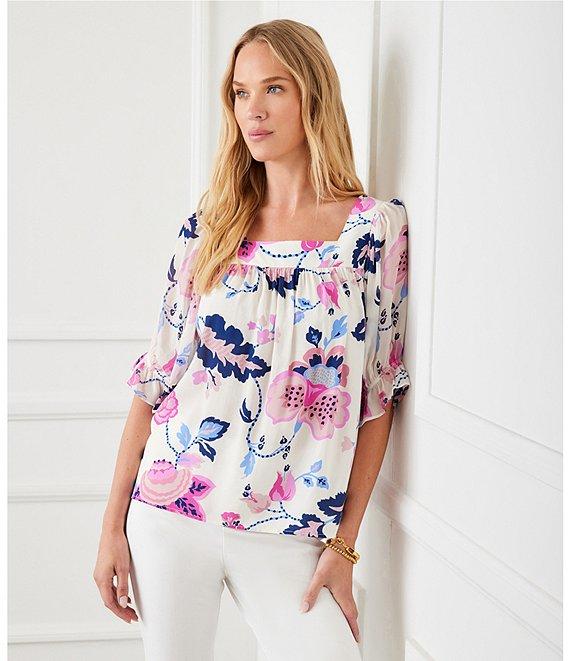 Karen Kane Petite Size Floral Contrast Square Neck Elbow Sleeve Top