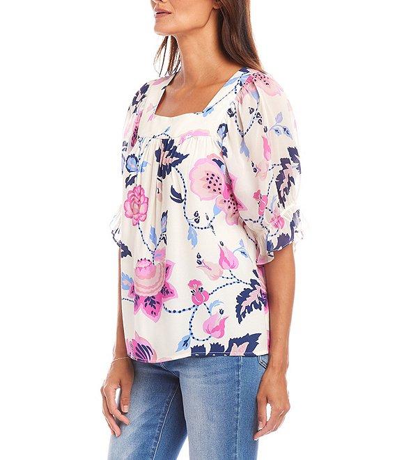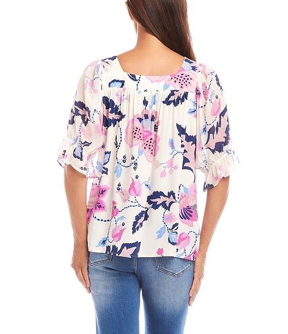 From Karen Kane Petite, this top features: Square neckline Elbow ruffled sleeves Floral print Unlined Straight hem Pullover construction Approx. 23.875" length Viscose Hand wash Imported.