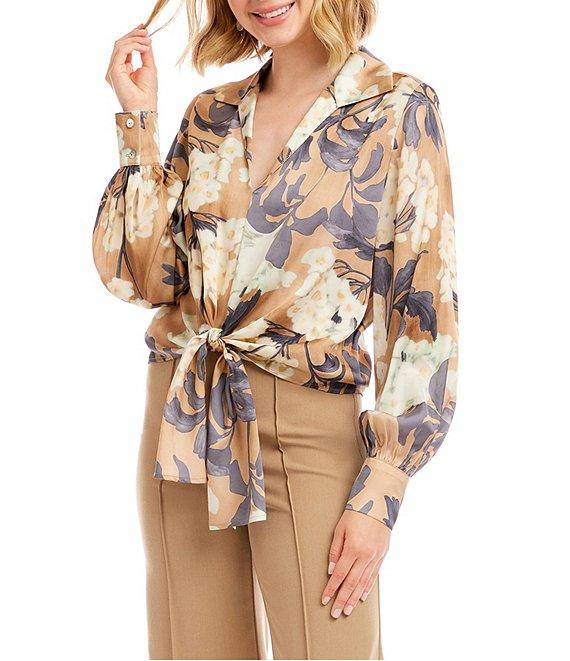 From Karen Kane, this top features: Satin fabrication Hydrangea floral print Wing Collar Long blouson sleeve with button cuffs Tie-front hem Unlined Pullover construction Approx. 21" length Viscose Ecovero/Viscose Hand wash Imported of Italian Fabric. Crafted in a luxurious Hydrangea Satin Print, this blouse showcases a soft, lustrous finish with an elegant floral design. A collared neckline adds classic polish, while the long blouson sleeves with shell button cuffs bring a refined touch. The tie-front detail creates a flattering silhouette, making it versatile for both day and evening wear.