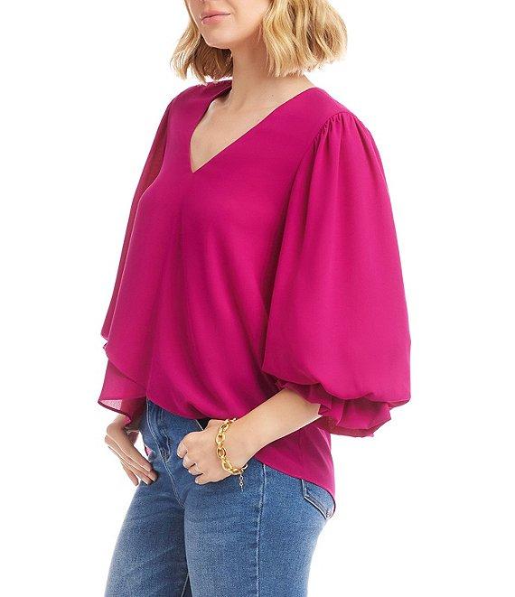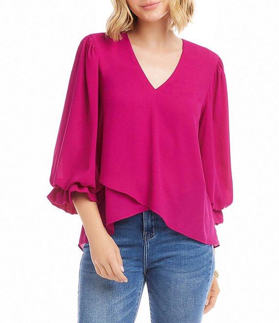 From Karen Kane Petite, this top features: Woven fabrication Classic silhouette V-neckline Lantern sleeves Lined Asymmetric layered front hemline Pullover construction Approx. 25" length Polyester; lining: rayon Hand wash Made in the USA of imported fabric.