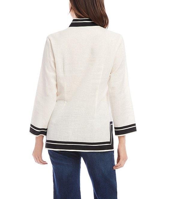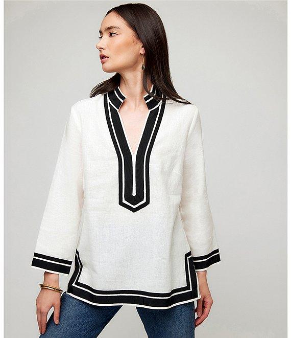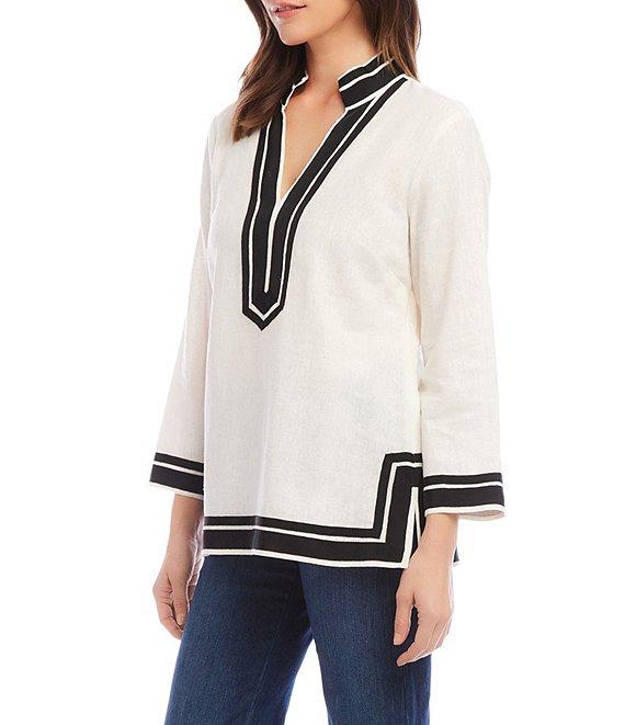 From Karen Kane Petite, this tunic features: Luxurious linen-blend fabrication Y-neckline Bracelet length sleeves Unlined Contrast trim detail Straight hem with side vents Pullover construction Approx. 27.375" length Linen/viscose Hand wash Imported. The St. Tropez Tunic is the epitome of chic and effortless style. Made from a luxurious linen blend material, this tunic features a mandarin collar and flare sleeves for a trendy touch. The ribbon edge detail adds a touch of elegance to this must-have piece. Perfect for any occasion, this tunic is both comfortable and stylish.