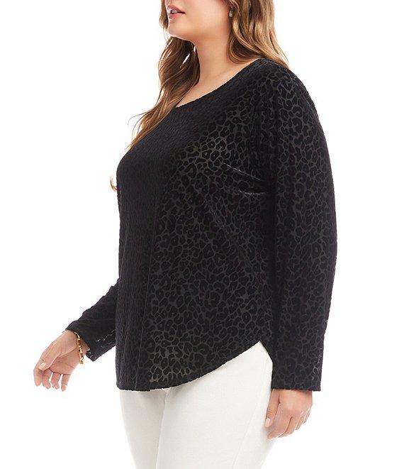 From Karen Kane Plus, this top features: Velvet burnout fabrication Scoop neckline Long sleeves Animal-inspired pattern Shirttail hemline Pullover construction Approx. 27.5" length Polyester/nylon/spandex/ Hand wash cold/hang to dry Imported.
