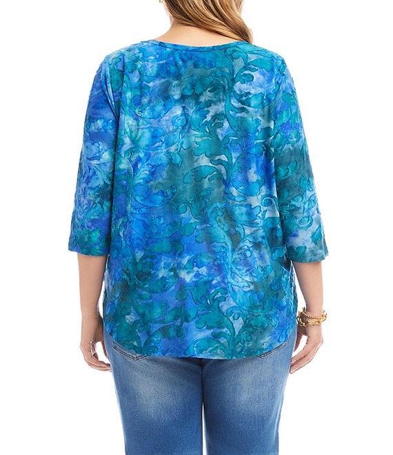 Karen Kane Plus Size Burnout Tie-Dye Crew Neck 3/4 Sleeve Top