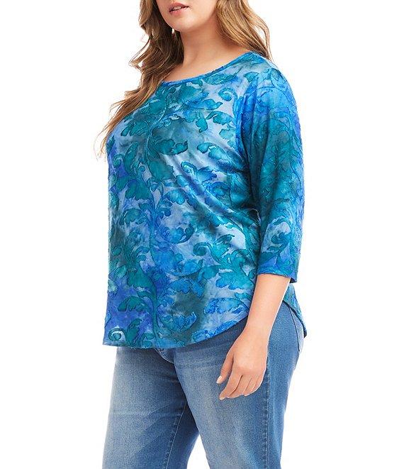 From Karen Kane Plus, this top features: Burnout tie-dye jacquard fabrication Crew neckline 3/4 sleeves Blends sheer texture Shirttail hemline Pullover construction Approx. 27.5" length Polyester/rayon/spandex Hand wash Imported.