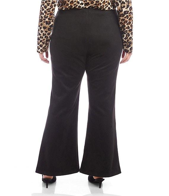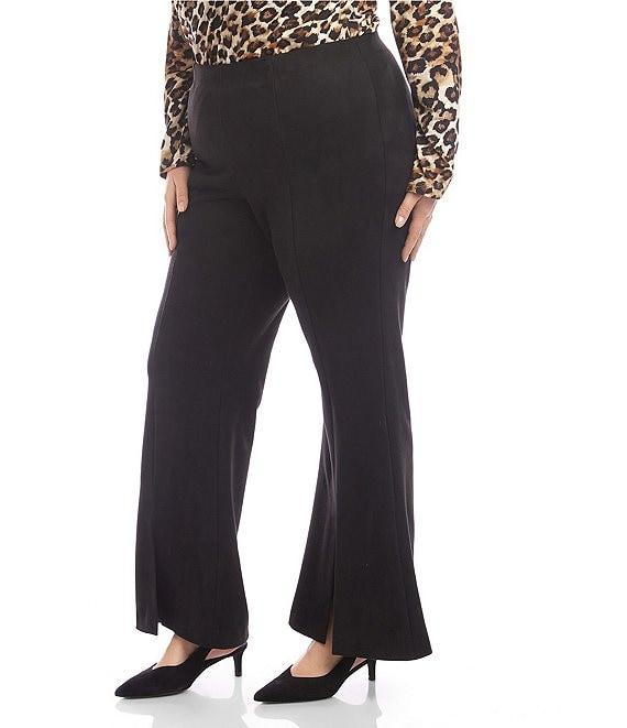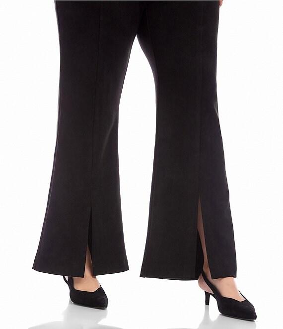 From Karen Kane Plus, these pants feature: Faux suede fabrication High rise Flare leg Elastic waistband No pockets Front slit detail at hem Pull-on construction Approx. 31.5" inseam; 11.5" rise Polyester/spandex Hand wash cold Made in the USA of imported fabric.