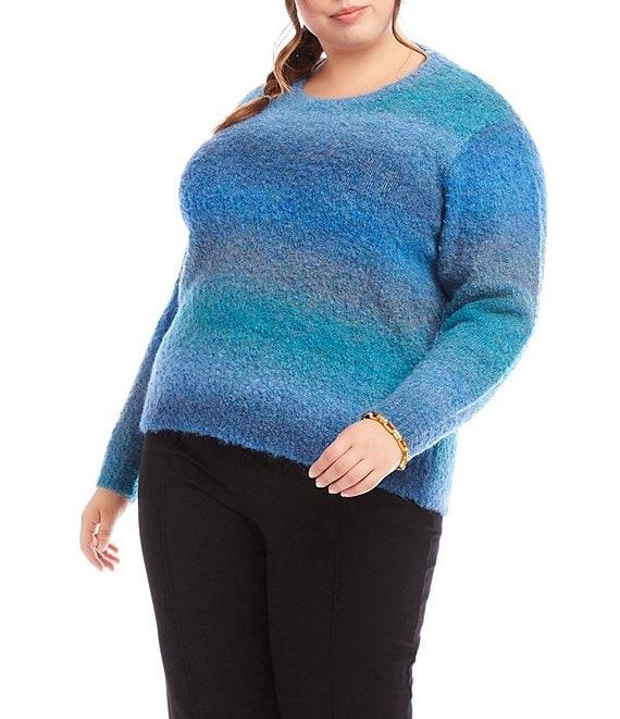From Karen Kane Plus, this sweater features: Crew neckline Long sleeves Ombre color pattern Hits at waist Soft, roomy fit allows for easy movement Straight hemline Pullover construction Approx. 25.5" length Recycled polyester/polyester/nylon/wool/spandex Dry clean Imported. Karen Kane Plus Size Ombre Boucle Sweater Experience ultimate comfort in our Ombre Boucle Sweater. The soft, roomy fit allows for easy movement, while the ombre color knit and boucle yarn add a stylish touch.