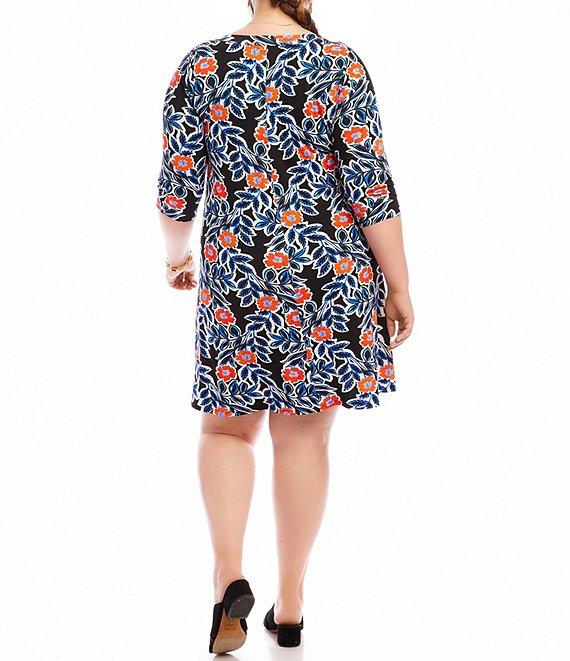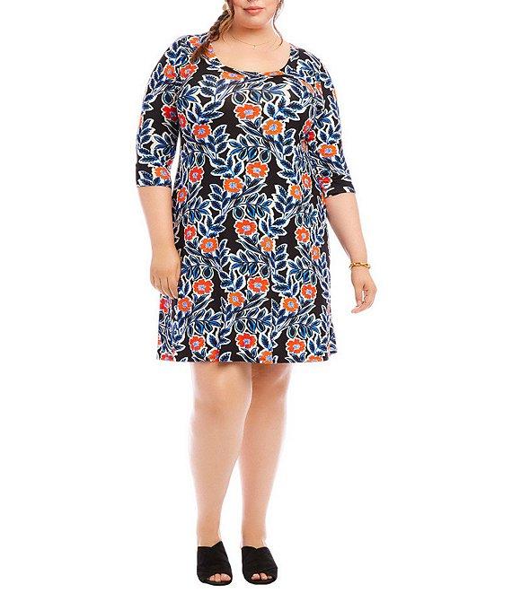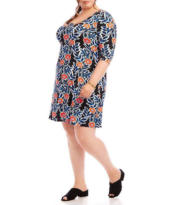 From Karen Kane Plus, this dress features: Stretch fabrication A-line silhouette Scoop neckline 3/4 sleeves California poppy print Hits at the knee Straight hemline Pullover construction Approx. 40" in length Viscose/elastane; partial liner: rayon/spandex Hand wash cold separately; hang to dry Dry clean if necessary Made in the USA of Italian fabric. Karen Kane Plus Size 3/4 Sleeve A-Line Dress This A-Line Dress features a vibrant California poppy print and 3/4 sleeves, adding a touch of elegance to any outfit. Made from a comfortable stretch material, this dress offers both style and comfort. Perfect for any occasion, from a casual day out to a night out., Care: HAND WASH COLD SEPARATELY, HANG TO DRY OR DRY CLEAN ,Viscose, Elastane, Made in the USA of Italian fabric, Rise: N/A, Inseam: N/A, Length: 40 inches (size 2X), Trim: N/A, Hits At: Knee Length, Scoop Neck, 3/4 sleeve, Set-in sleeves, Pullover, No pockets, Lined: RAYON, SPANDEX (Partial)