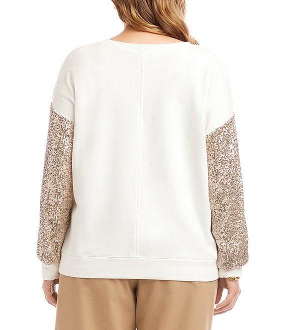 From Karen Kane Plus, this top features: Soft fleece knit & sequin fabrication Crew neckline Long sequin sleeves with cuffs Drop shoulders Pullover construction Approx. 25" length Cotton/polyester/modal; sleeve lining: polyester/spandex (partially) Hand wash Imported. Effortless comfort with a touch of shine. Crafted from soft fleece knit, this long sleeve top features a classic crew neckline and relaxed drop-shoulder design for an easy, laid-back fit. Designed in a pull-on style, it's finished with statement sequin detailing exclusively on the sleeves for the perfect mix of cozy and glam.