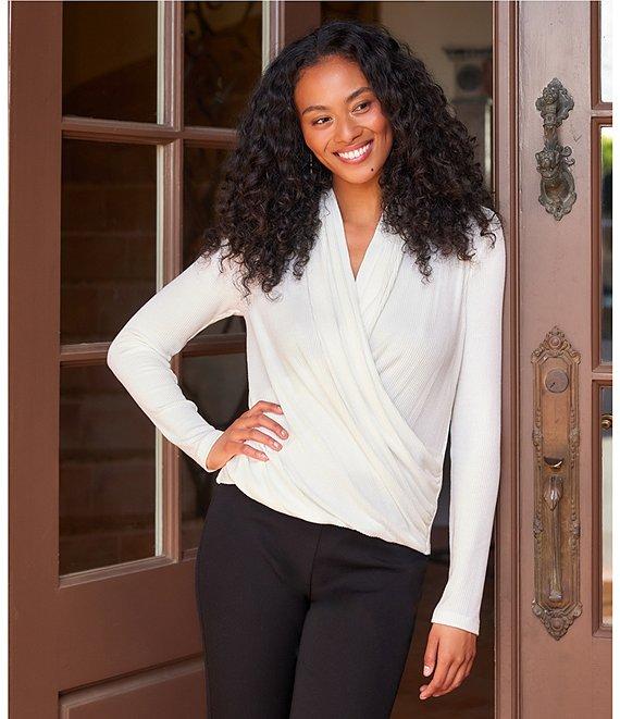 Karen Kane Ribbed Brushed Knit Long Sleeve Drape Front Crossover Top