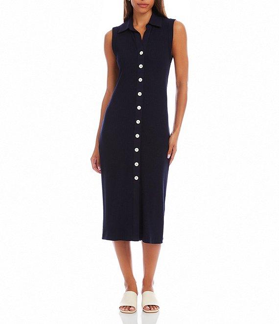 Karen Kane Ribbed Knit Contrast Collar Sleeveless Button Front Sheath Midi Dress