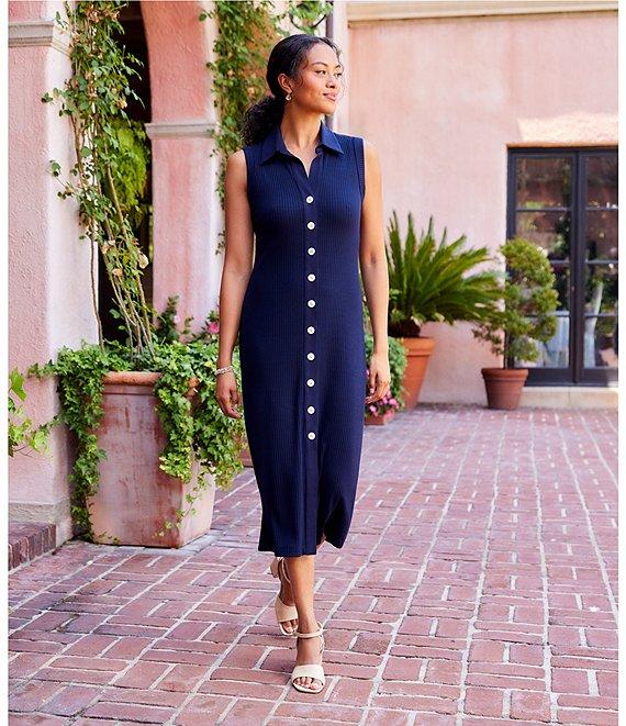From Karen Kane, this dress features: Ribbed knit fabrication Sheath silhouette Contrast point collar Sleeveless Straight hemline Button front closure Approx. 46.75" length Viscose/spandex Hand wash cold/dry flat Made in the USA.