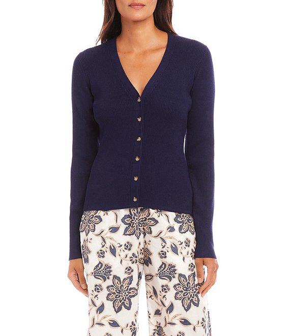 From Karen Kane, this cardigan sweater features: Ribbed fabrication V-neckline Long sleeves Unlined Front button closure Approx. 22.75" length Rayon/nylon Hand wash cold/flat dry or dry clean Imported.