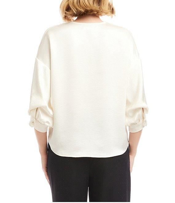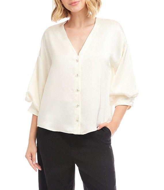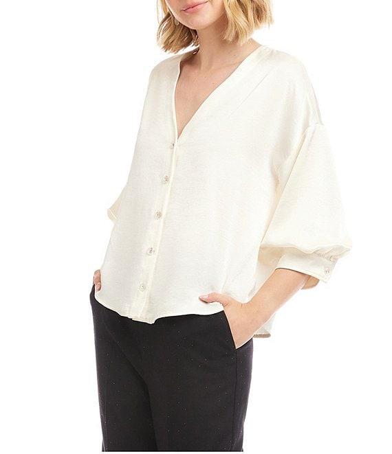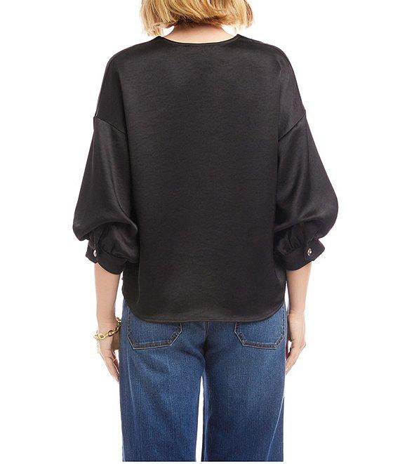 Karen Kane Satin V-Neck 3/4 Lantern Sleeve Rhinestone Button Front Top