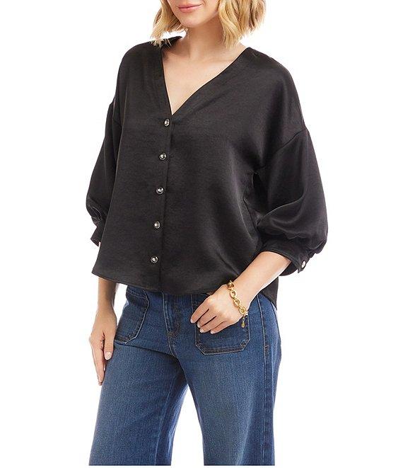 From Karen Kane, this top features: Satin fabrication V-neckline 3/4 lantern sleeves with cuffs Rhinestone buttons Button-front closure Approx. 24" length Polyester/recycled polyester Dry clean Made in the USA of Imported fabric.