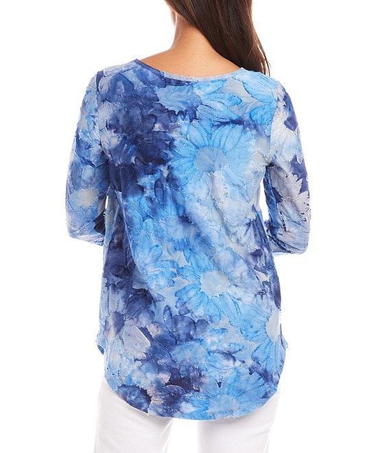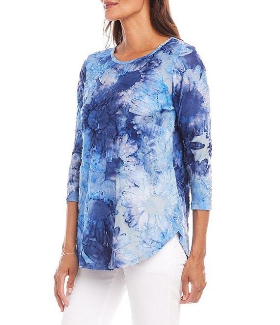 From Karen Kane, this top features: Stretch tie-dye Print design Scoop neckline 3/4 sleeves Pullover construction Shirttail hem Approx. 27.25" length Polyester/rayon/spandex Hand wash cold/flat dry or dry clean Imported. Karen Kane Tie-Dye Burnout Shirttail Top This top features a unique tie dye burnout pattern, with a flattering scoop neck. The 3/4 sleeves add a touch of style to this versatile top.