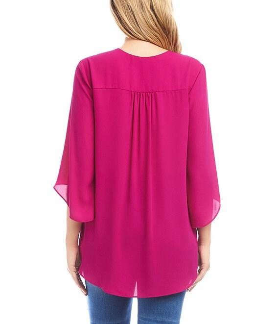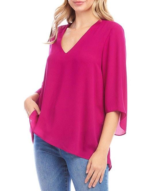 From Karen Kane, this top features: Silky crepe fabrication V-neckline 3/4 flare sleeves Unlined Perfect for a day at work or a casual night out Asymmetric crossover front hem Pullover construction Approx. 29.75" length Polyester Hand wash Made in the USA of imported fabric