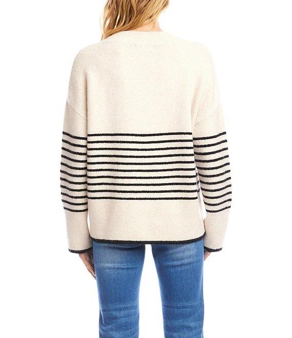 From Karen Kane, this sweater features: Knit fabrication V-neckline Drop shoulders Long sleeves Horizontal striped Ribbed detail at neck, sleeves and hemline Pullover construction Approx. 23.5" length Acrylic/polyester/spandex Hand wash cold/dry flat Imported.