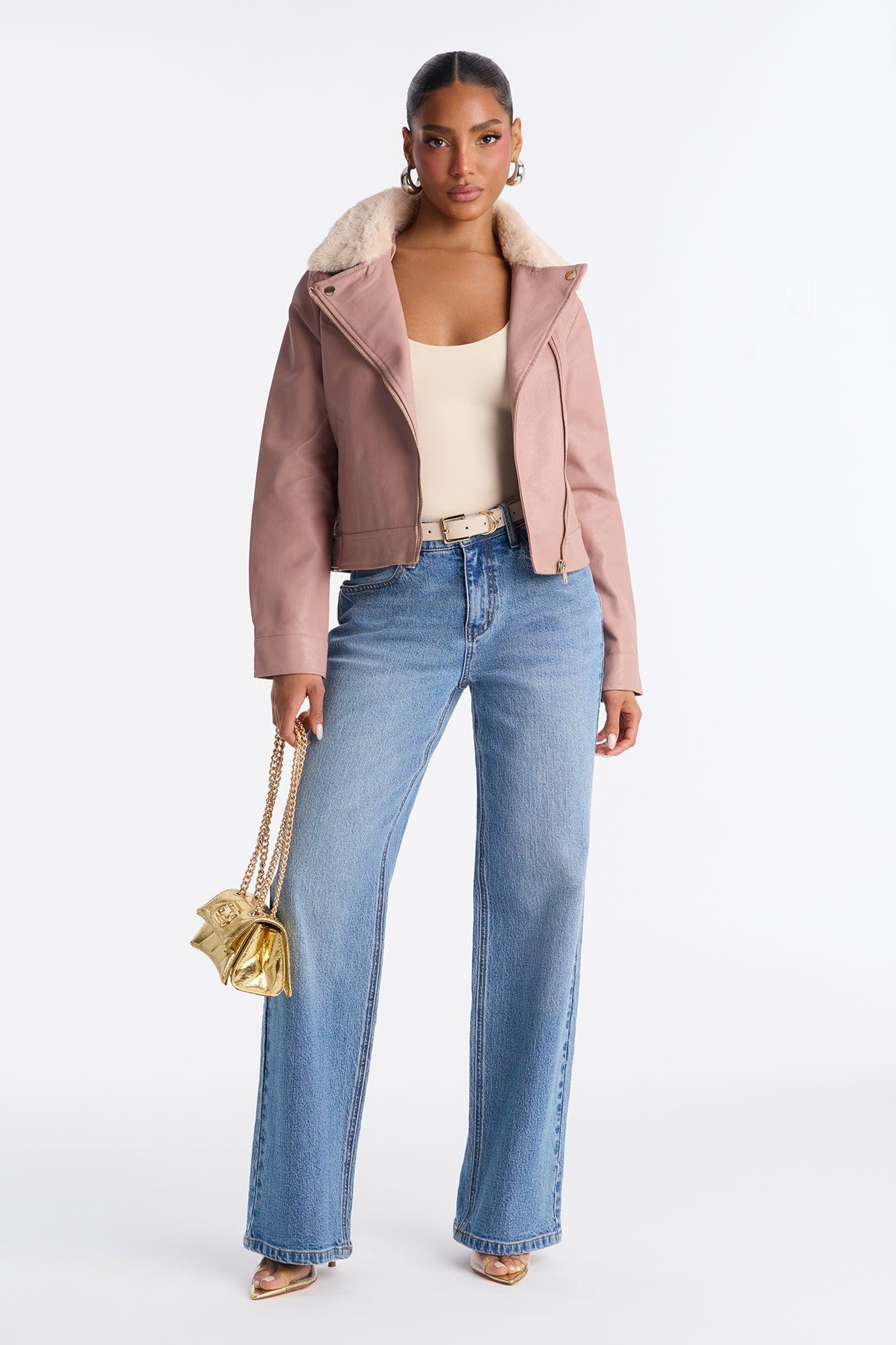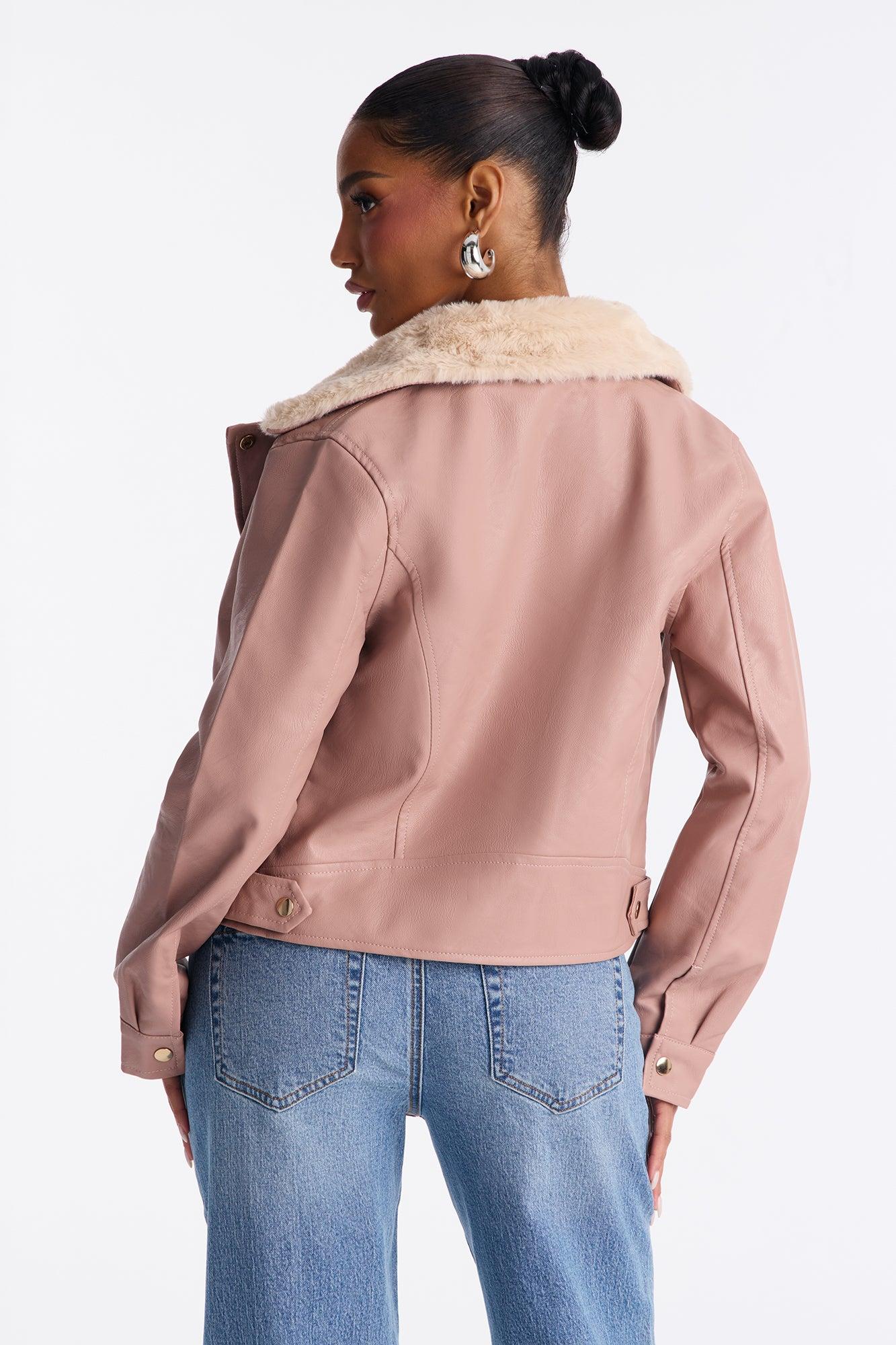 Available In Blush. Faux Leather Moto Jacket Faux Fur Collar Long Sleeves Zipper Closure Zipper Detail Fully Lined Shell: 85% Polyester 15% Rayon Coating: 100% Polyurethane Lining: 100% Polyester Imported California Proposition 65WARNING: Cancer and Reproductive Harm - www.P65Warnings.ca.gov.