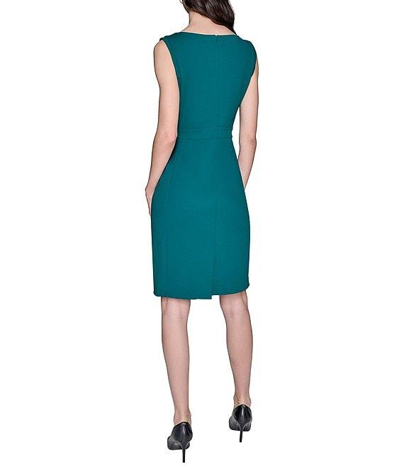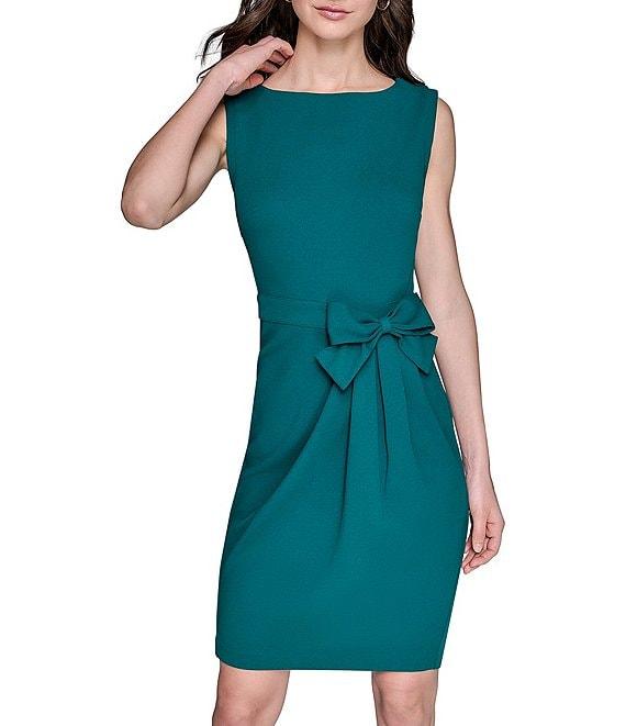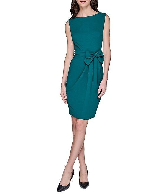 From KARL LAGERFELD PARIS, this dress features: Scuba crepe fabrication Boat neckline Sleeveless Sheath silhouette Bow front detail Rouching at waist Back zipper closure Approx. 37.75" length Polyester/spandex Dry clean only Imported.