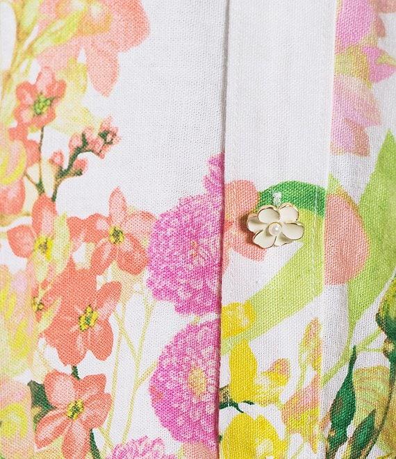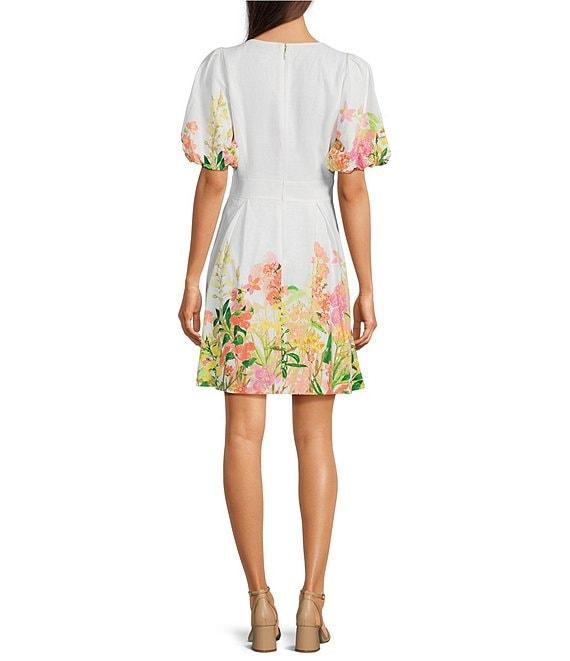 KARL LAGERFELD PARIS Floral Printed Linen Fit & Flare Short Puff Sleeve Dress