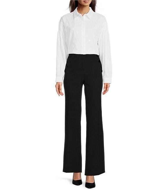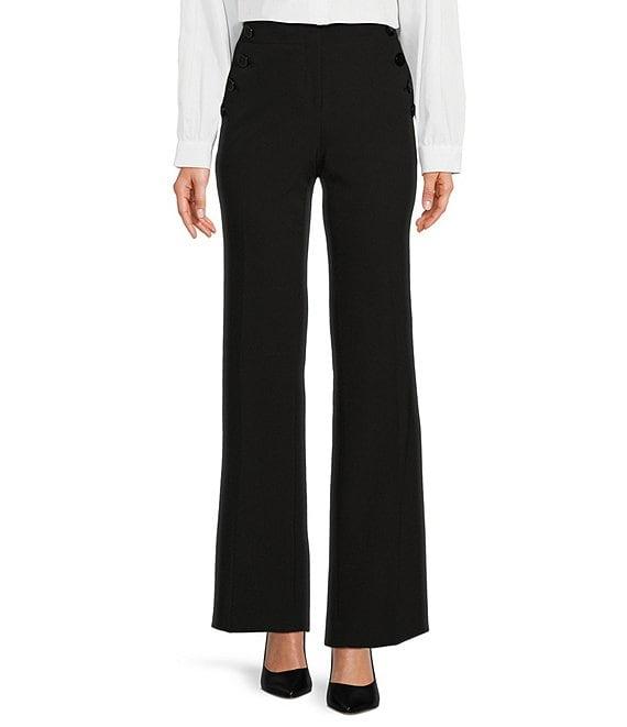 From KARL LAGERFELD PARIS, this pant features:Flat front silhouetteSailor buttonsHigh waistedFront button zipper closureWide legSide and back pocketsApprox. length 32.5"Polyester/spandexMachine wash/ lay flat to dryImported.