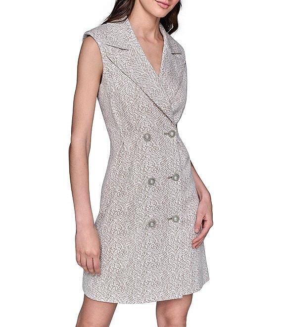 From KARL LAGERFELD PARIS, this dress features: Jacquard knit fabrication Blazer dress silhouette Notched collar neckline Sleeveless Fully lined Straight hemline Button front closure Approx. 36" length Rayon/polyester/spandex Dry clean Imported.