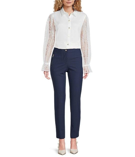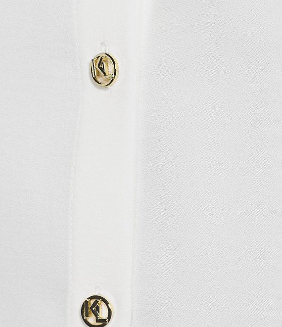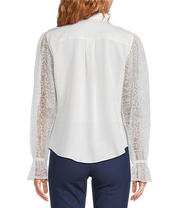 From KARL LAGERFELD PARIS, this blouse features: Mixed media fabrication Point collar Lace long sleeves Straight hemline Button front closure Approx. 24" blouse body, 33" sleeve length Polyester Hand wash Imported.