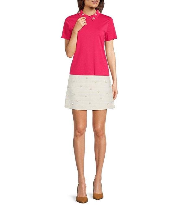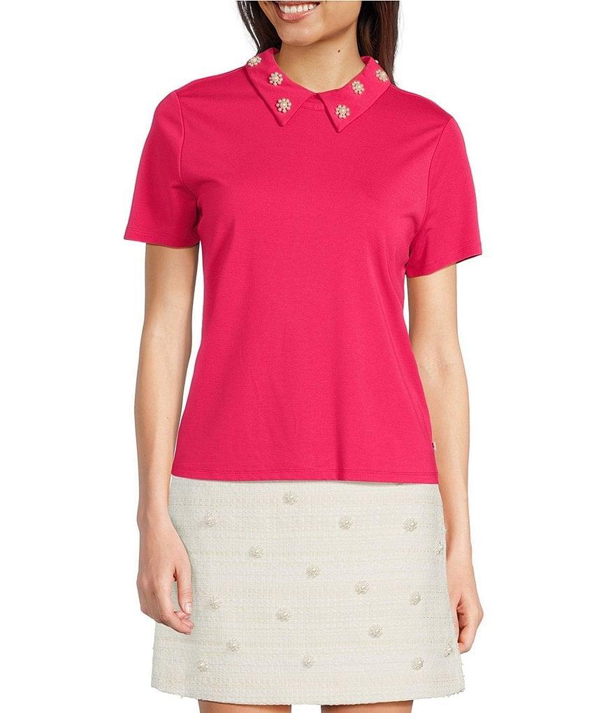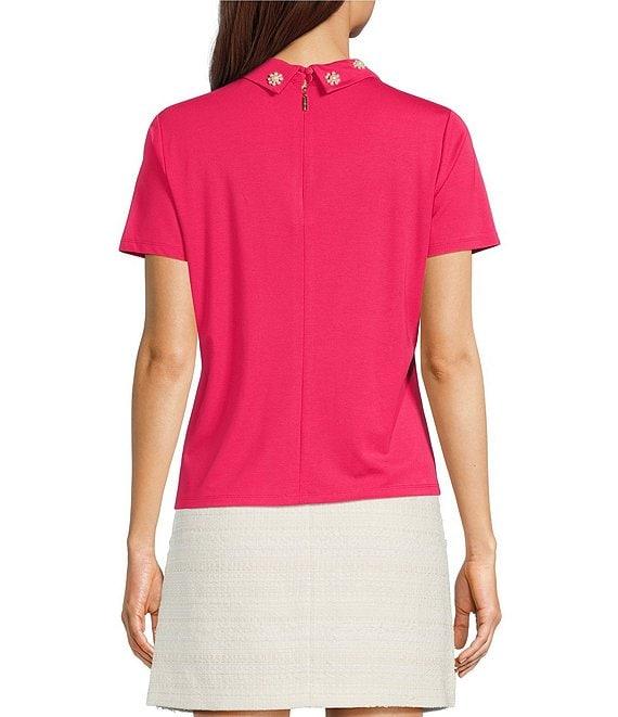 From KARL LAGERFELD PARIS, this top features: Knit fabrication Point collar neckline Short sleeves Pearl flower embellishment detailing on the collar Straight hemline Center-back invisible zipper closure Approx. 22.5" in length Rayon/nylon/spandex; unlined Hand wash Imported.