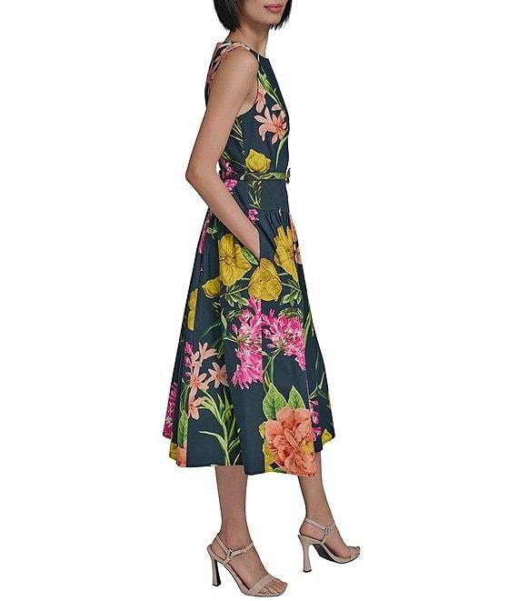 KARL LAGERFELD PARIS Poplin Floral Print Crew Neck Sleeveless Belted Drop Waist Midi Dress