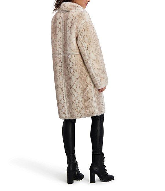 From KARL LAGERFELD PARIS, this coat features: Faux shearling fabrication Single breasted silhouette Python pattern Notch collar neckline Long sleeves Front welt pockets Faux leather detail Heavyweight Oversized fit Fully lined Straight hemline Button front closure Approx. 38" length Polyester; lining: polyester Dry clean Imported.