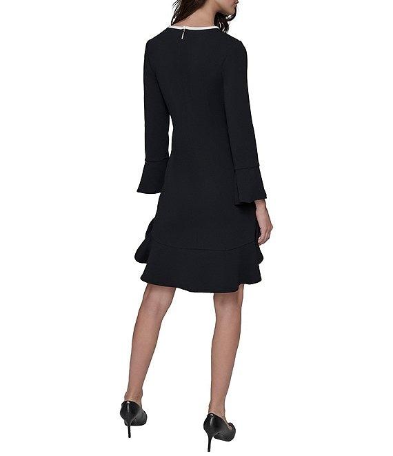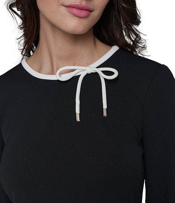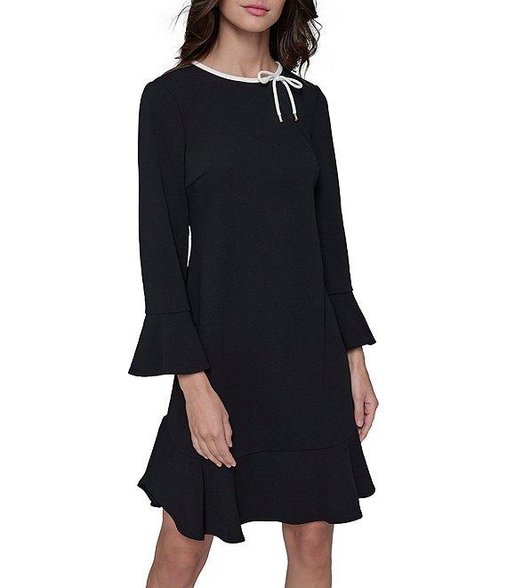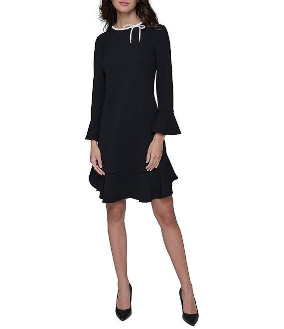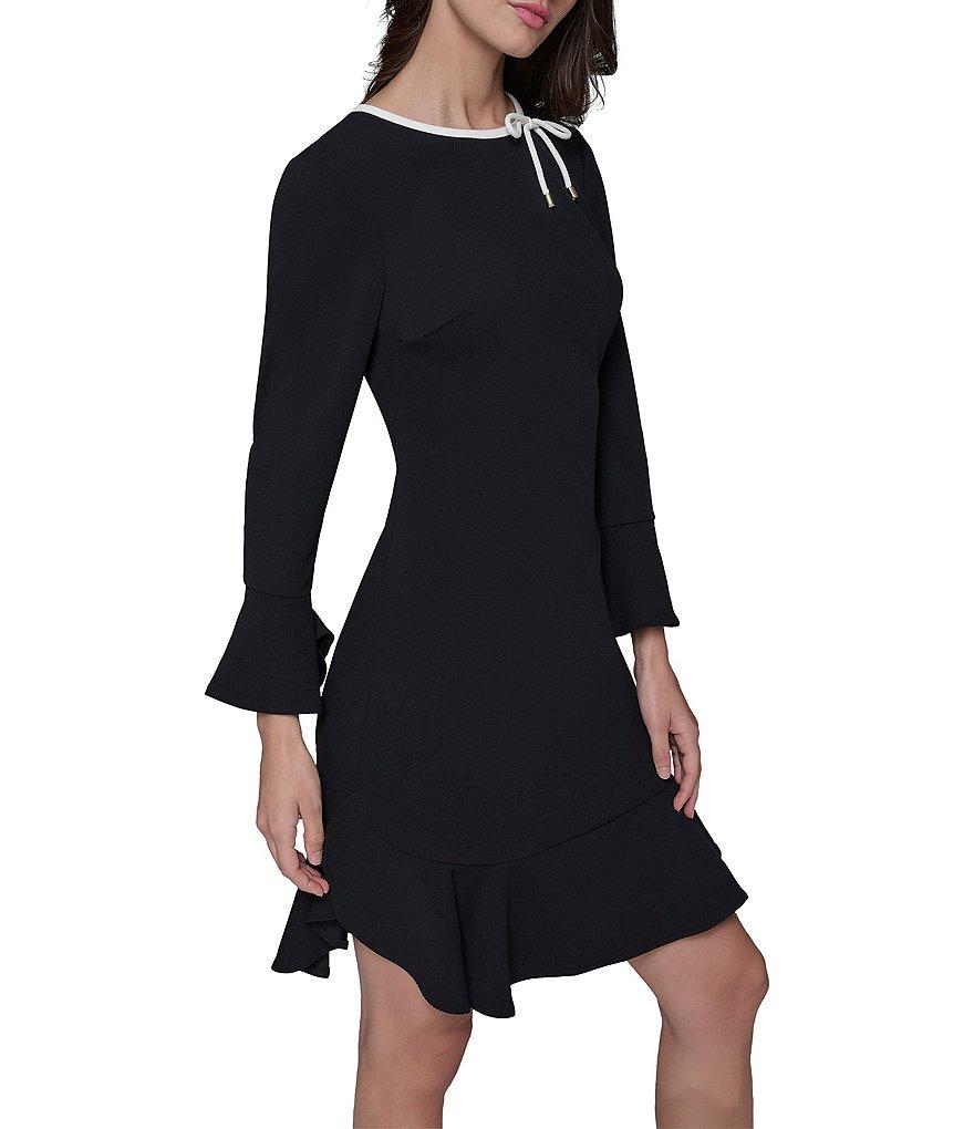 From KARL LAGERFELD PARIS, this dress features: Scuba crepe fabrication Sheath silhouette Round neckline 3/4 sleeves with bell cuffs Bow detail Partially lined Flounce hemline Center back zipper closure Approx. 37.5" length Polyester/spandex Dry clean Imported.