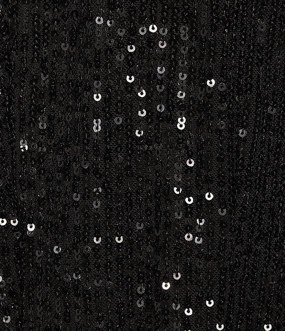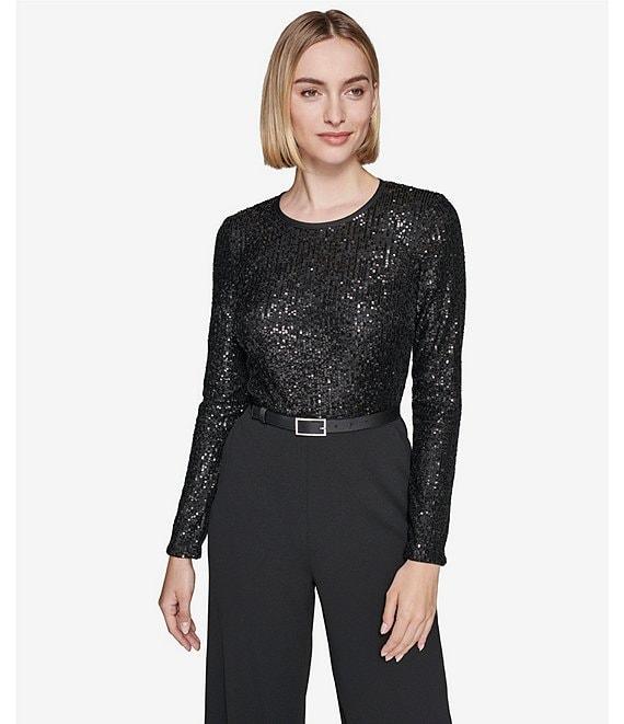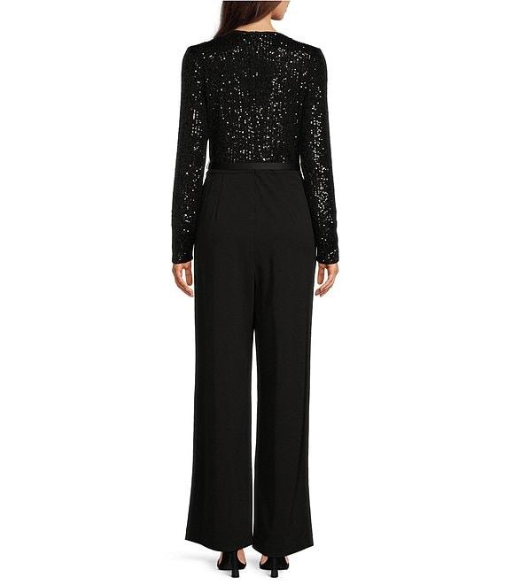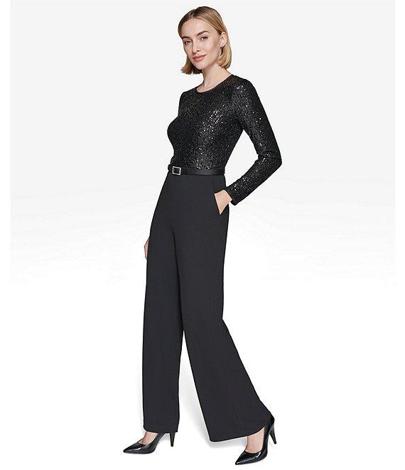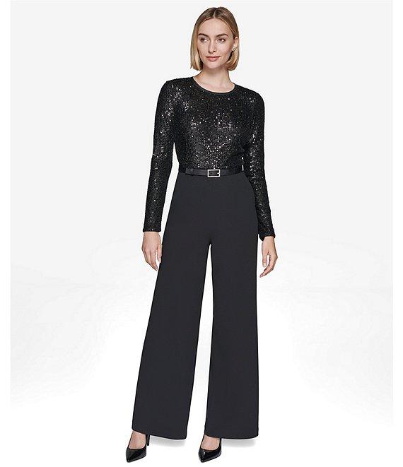 From KARL LAGERFELD PARIS, this jumpsuit features: Scuba crepe/waterfall sequin fabrication Round neckline Long sleeves Side seam pockets Belted Wide legs Fully lined Center back zip closure Approx. 32" inseam; 25" leg opening Polyester/spandex; lining: polyester/spandex Dry clean Imported.