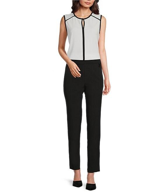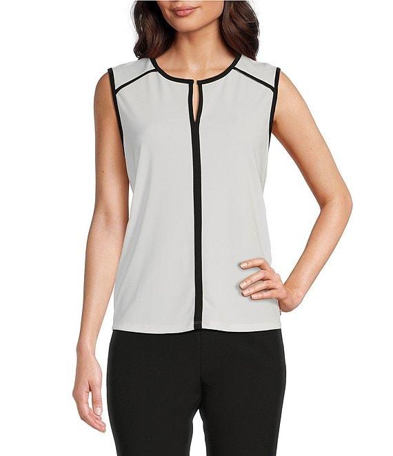 From KARL LAGERFELD PARIS, this blouse features: Cami silhouette Scoop neckline Sleeveless Contrast trim Keyhole Hook and eye Pullover construction Approx. 24" length Dry clean Imported.