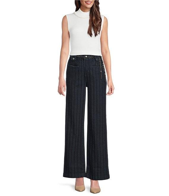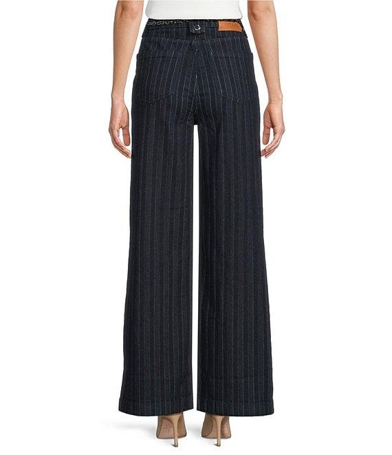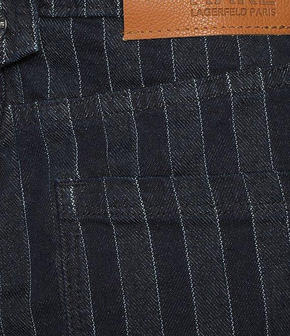 From KARL LAGERFELD PARIS, these jeans feature: Denim fabrication Wide leg silhouette Stripe print 4 pocket functional styling Buttoned belt loops Removable chain belt Full length Front button and zipper closure Approx. 32" inseam, 12.25" rise Cotton/spandex Remove belt before wash Machine wash Imported.