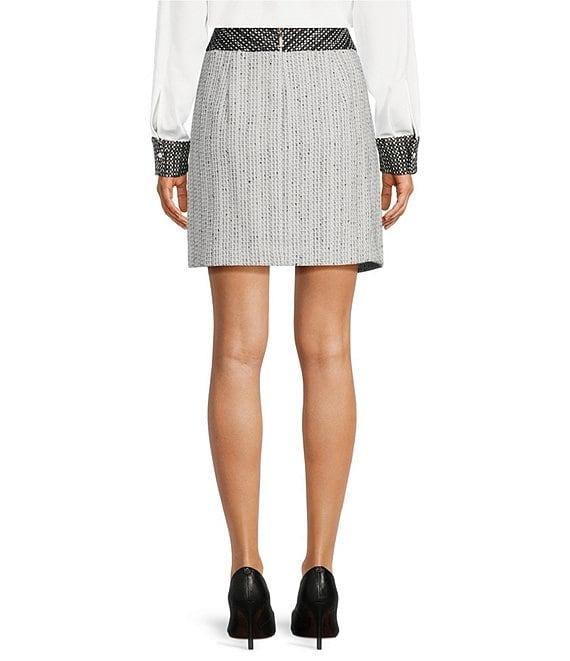 From KARL LAGERFELD PARIS, this skirt features: Tweed fabrication A-line silhouette Mini length Two non-functional flap pockets Center-back hook and eye/invisible zipper closure Approx. 18.5" in length Polyester/viscose/rayon/nylon/acrylic/cotton/wool Liner: polyester/spandex Dry clean Imported.