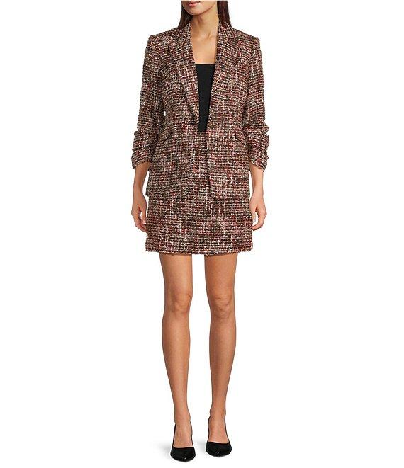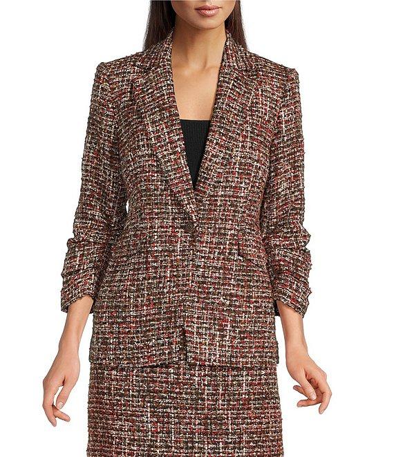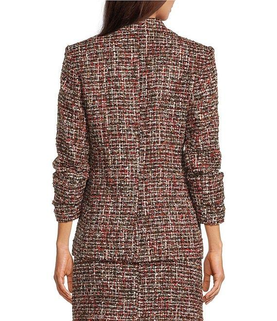 From KARL LAGERFELD PARIS, this jacket features: Tweed print fabrication Notch collar 3/4 sleeves Front functional pockets at hips Mid length Approx. 26.5" length from center back Button front closure Lined Polyester Dry clean only Imported.