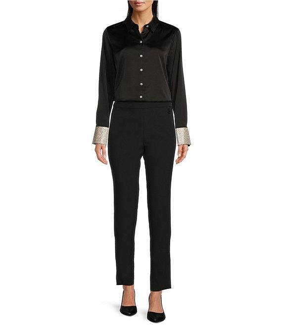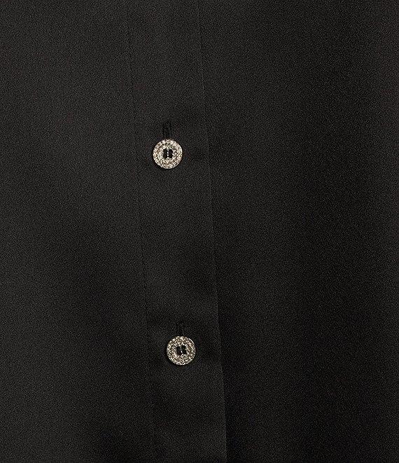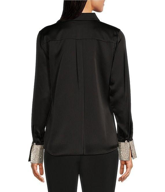 From KARL LAGERFELD PARIS, this top features: Woven fabrication Blouse silhouette point collar neckline Long sleeves Rhinestone cuffs Full button front closure Approx. 25" length; 32" sleeves polyester Hand wash cold with like colors inside out Imported.