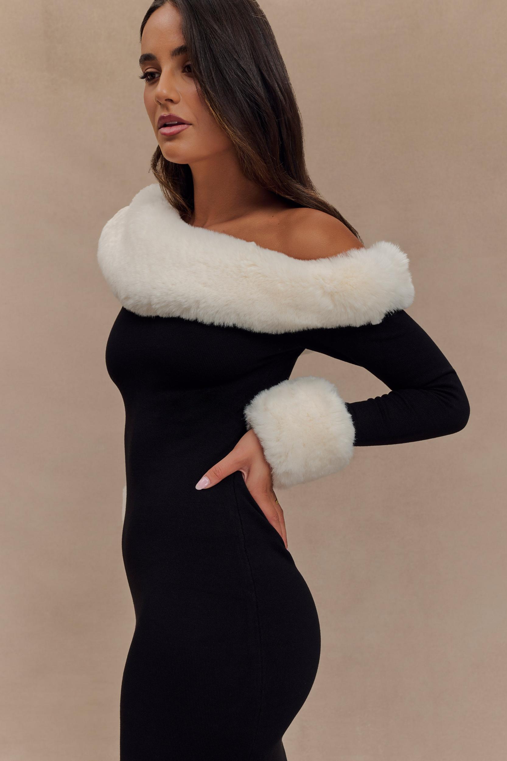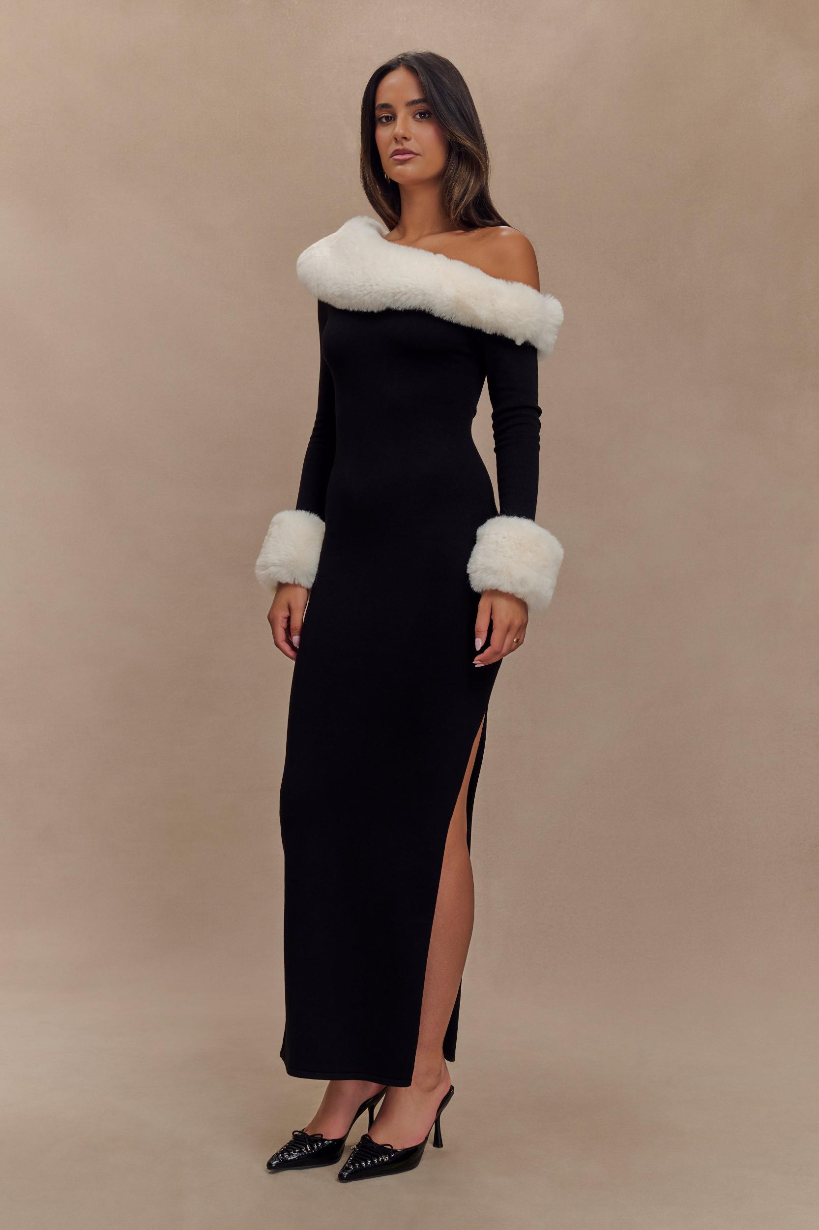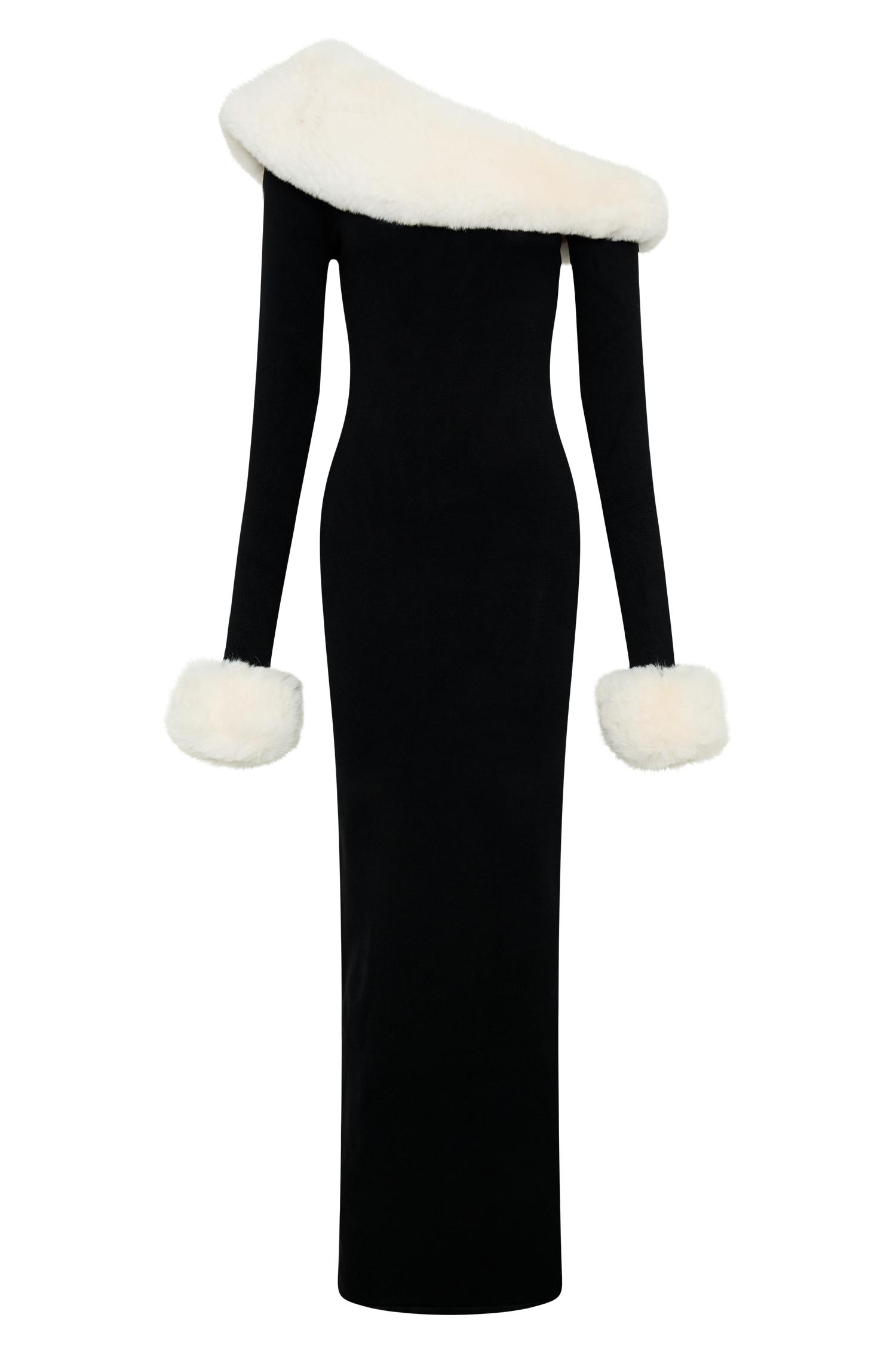 Fur the love of fashion. The KARLEIGH Faux Fur Knit Maxi Dress is a luxurious blend of cosy elegance and contemporary style. Featuring a striking asymmetrical neckline and crafted from soft knit fabrication, this dress offers a figure-hugging bodycon fit that’s both flattering and comfortable. The long sleeves are enhanced with plush faux fur cuffs, while the fur neckline adds an extra touch of warmth and sophistication. With its maxi length and sleek silhouette, this dress is the perfect choice for a chic evening out or any event where you want to stand out in style.