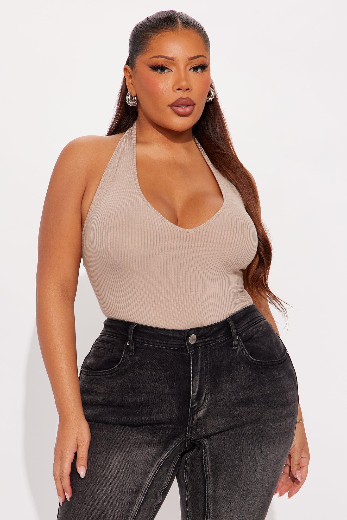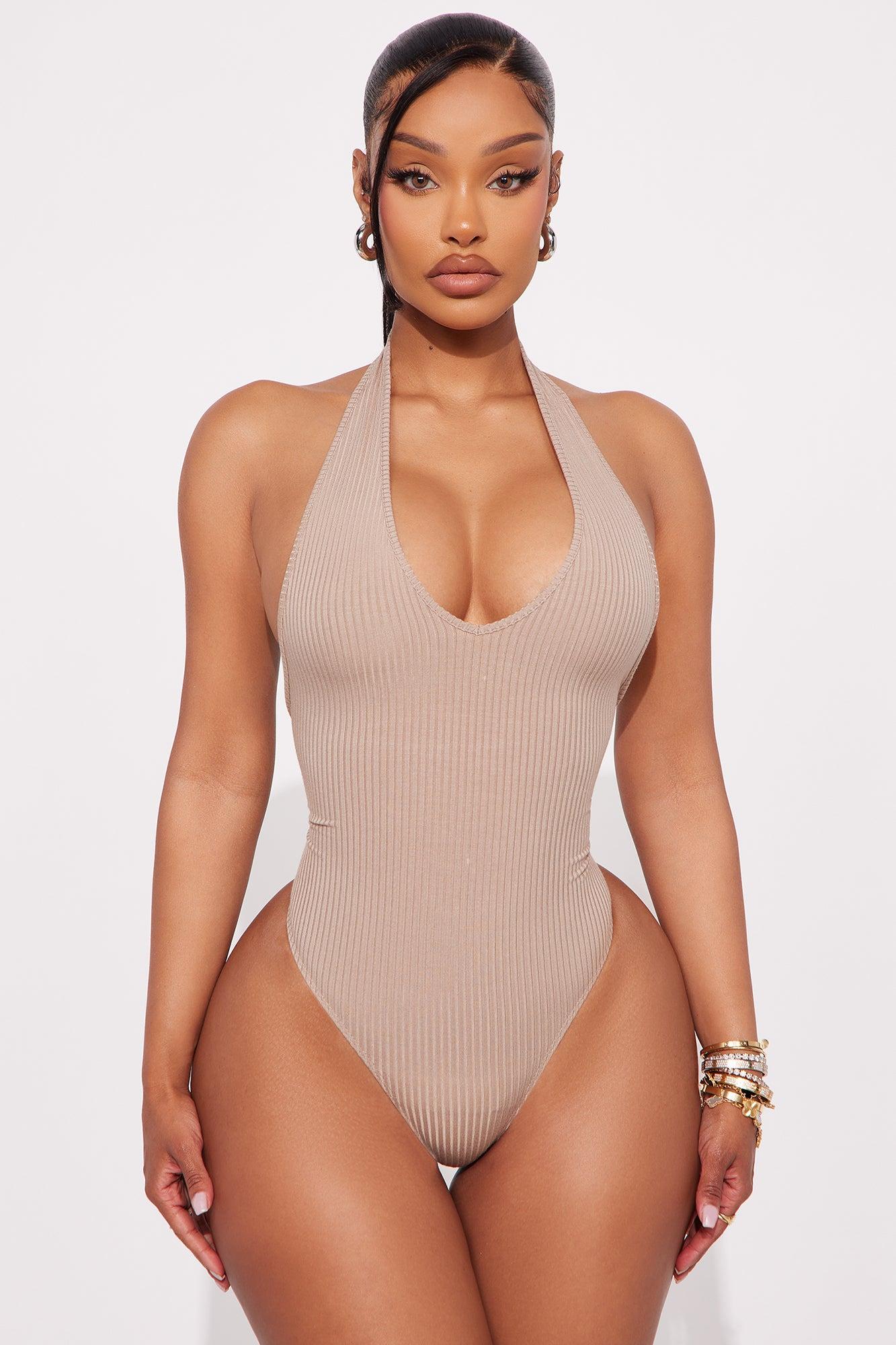 Available In Black, Olive, Red, Taupe And White. Bodysuit Scoop Neck Sleeveless Backless Detail Cheeky Bottom Snap Button Closure Final Sale Ribbed Stretch 93% Rayon 7% Spandex Imported