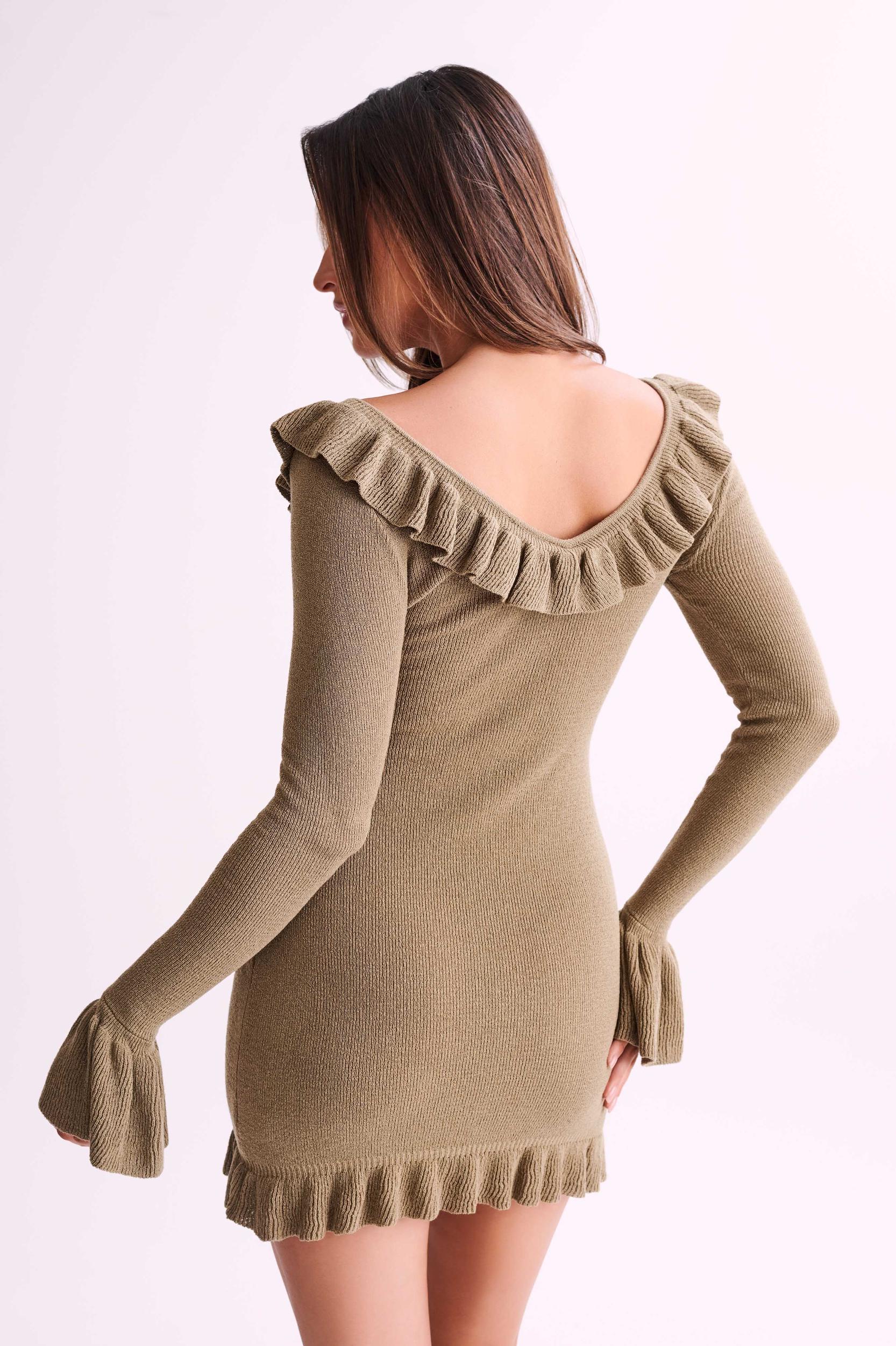 “Plans Saturday?”Crafted from unlined knit fabric, KAROLINA boasts a sophisticated V neckline, a shaped hem, and long sleeves. The ruffle design elevates the overall look of the dress, adding a fun and flirty element to the edges and the center front. This flirtatious vibe complements the mini length and bodycon fit, ensuring you stand out at any summer outdoor events.