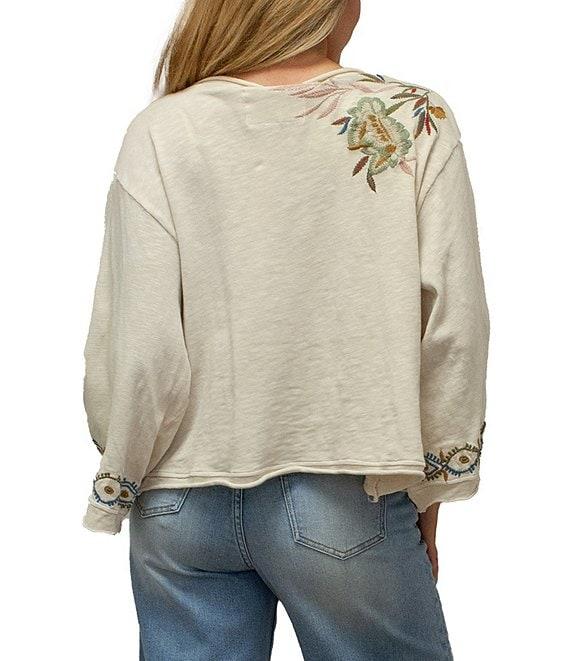 From Karyn Seo, this cardigan features: Knit fabrication Cardigan silhouette Vintage floral embroidery Open front neckline Long sleeves with geometric detail Relaxed fit Straight hemline Tie front closure Approx. 22" length Cotton Machine wash/lay flat Imported.