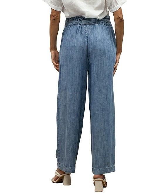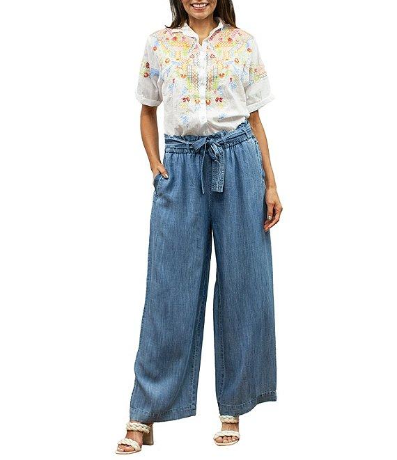 From Karyn Seo, these pants feature:Chambray fabricationWide legPaper bag waistElastic waistbandSide seam functional pocketsRemovable self tiePull-on constructionApprox. 27" inseamRayon/TencelMachine wash cold, flat dry or dry cleanImported.