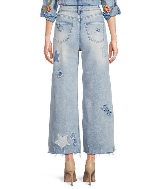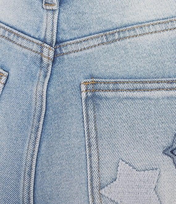 From Karyn Seo, these jeans feature: Denim fabrication Slight stretch Faded Darker distressing Frayed star patches Front and back pockets Boho-inspired Raw hemline Front zip fly and button closure Approx. 27" inseam Cotton/polyester/spandex Machine wash cold/flat dry Imported.