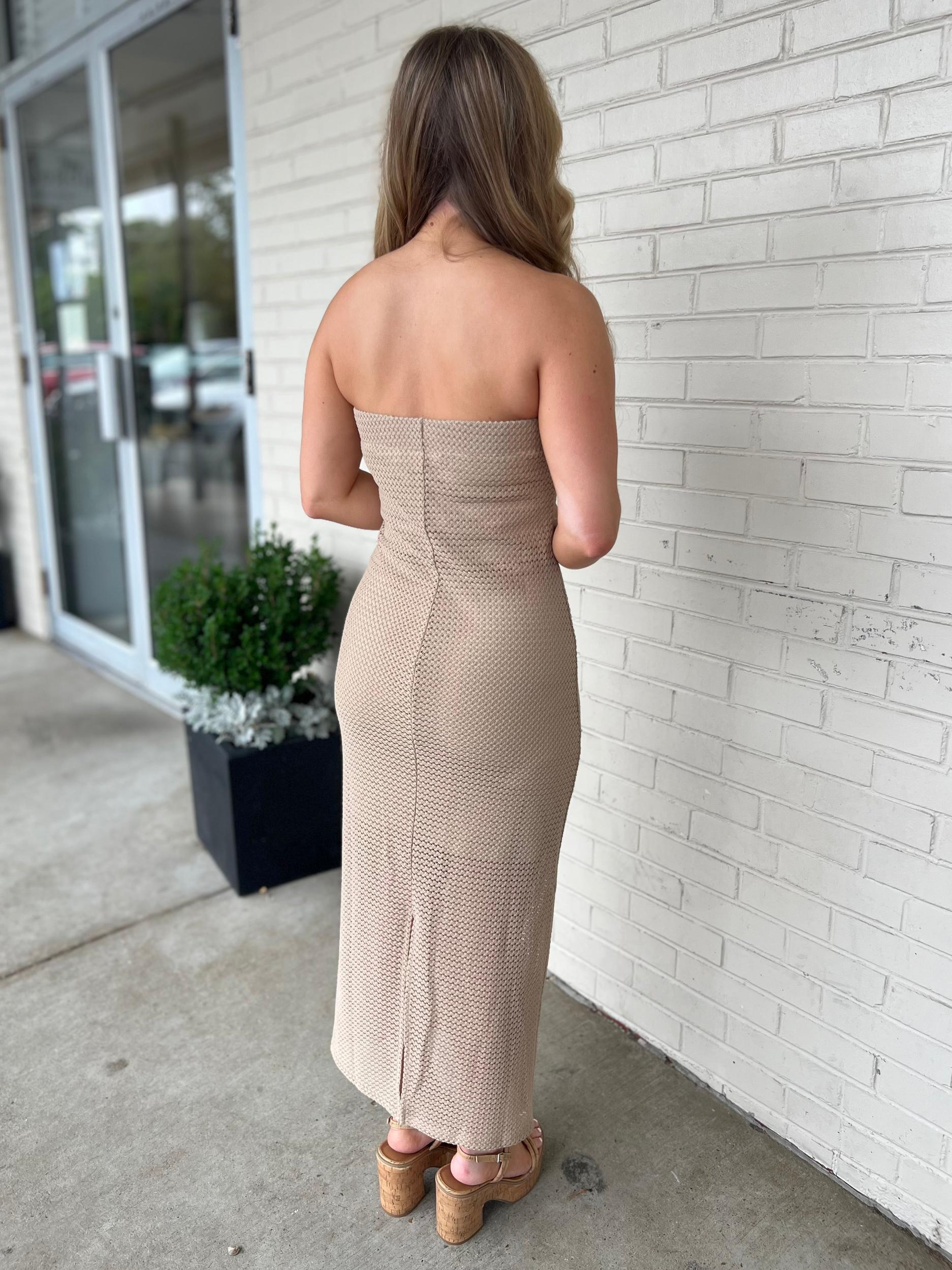 The Kasandra Dress is a playful, fitted midi dress crafted from open knit fabric with a partial lining for comfort. This strapless beauty features a charming front beaded detail and a flirty keyhole, all in a natural shade that’s perfect for any sunny occasion.