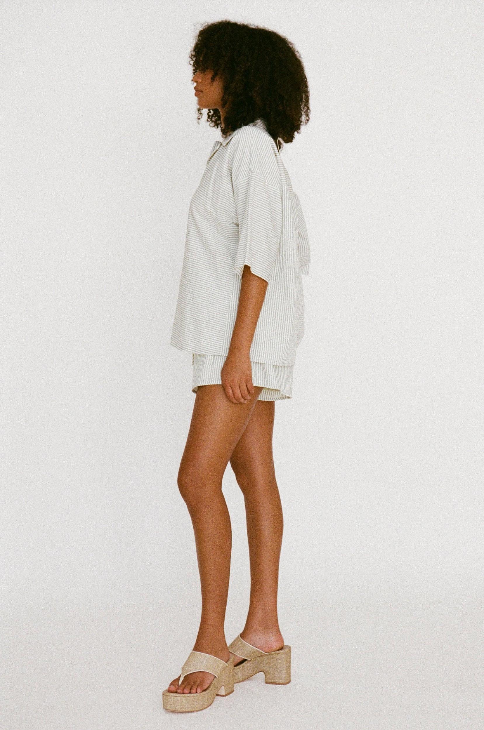 *THIS IS A FINAL SALE ITEM and cannot be returned. See our Returns Policy here The perfect summer set! The Kase Shorts are made from a natural cotton voile fabric with white and sea foam stripes. They are a high waisted style featuring an elasticated waist with drawstring, high-low hems and twin pockets at front. Complete the look with the Kase Top and SBO Market Tote Bag! Designed exclusively by Sabo.