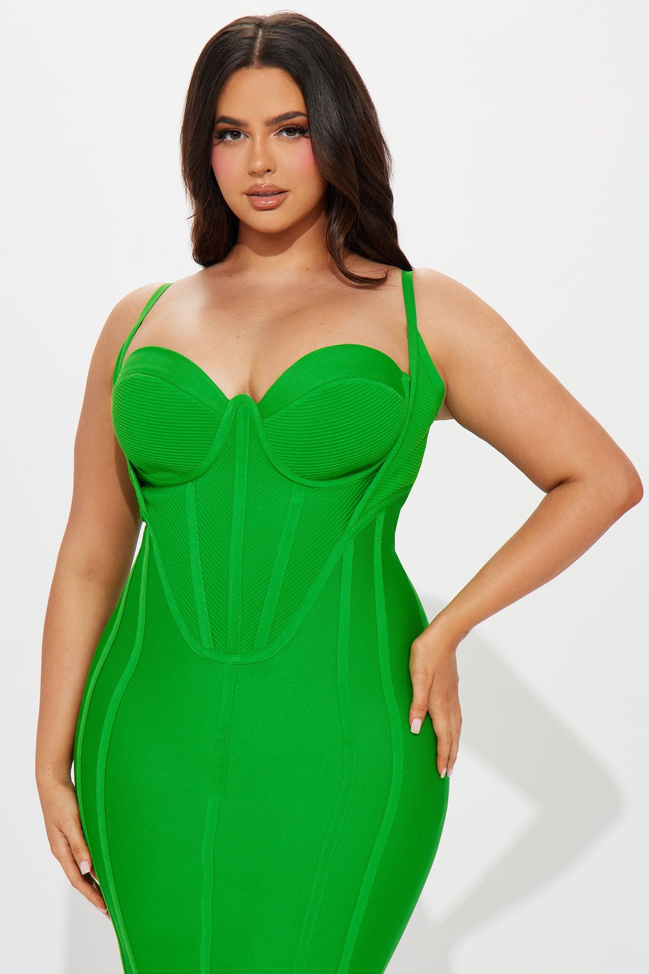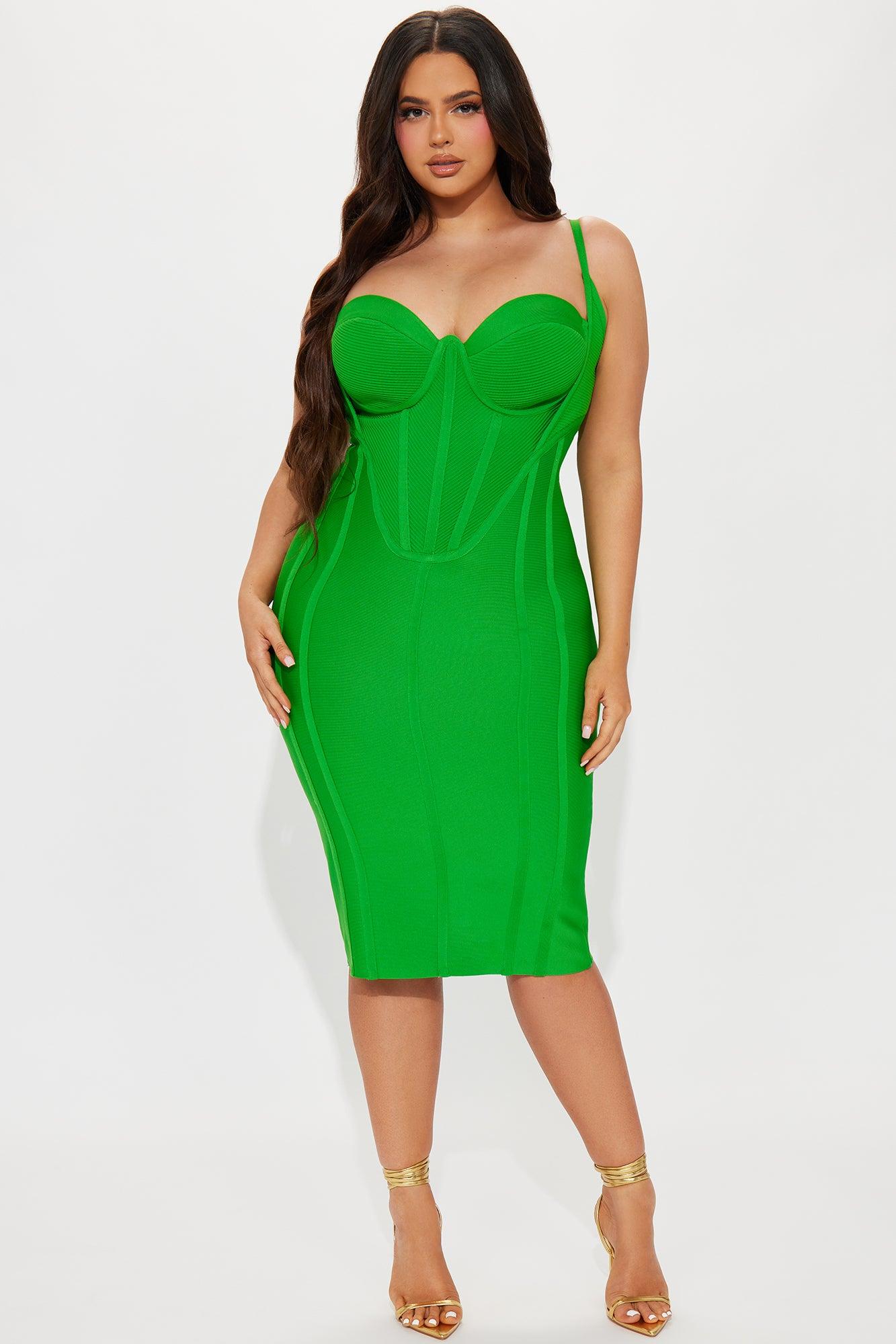 Available In Green And White. Bandage Midi Dress Adjustable Spaghetti Straps Corset Waist w/ Boning Padded Bra Cups w/ Underwire Contrast Stitching Detail Hidden Back Zipper Stretch 90% Polyester 10% Spandex Imported California Proposition 65WARNING: Cancer and Reproductive Harm - www.P65Warnings.ca.gov.