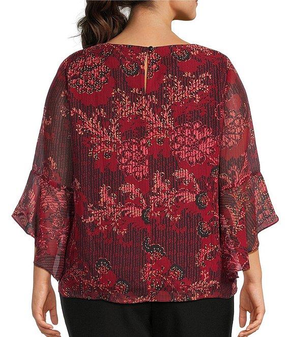 Kasper Plus Size Chiffon Floral Print Boat Neck Long Ruffle Sleeve Blouse