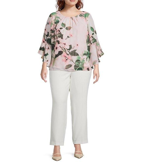 Kasper Plus Size Floral Print 3/4 Flutter Sleeve Keyhole Neckline Chiffon Blouse