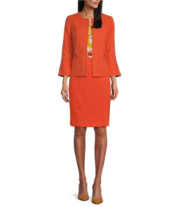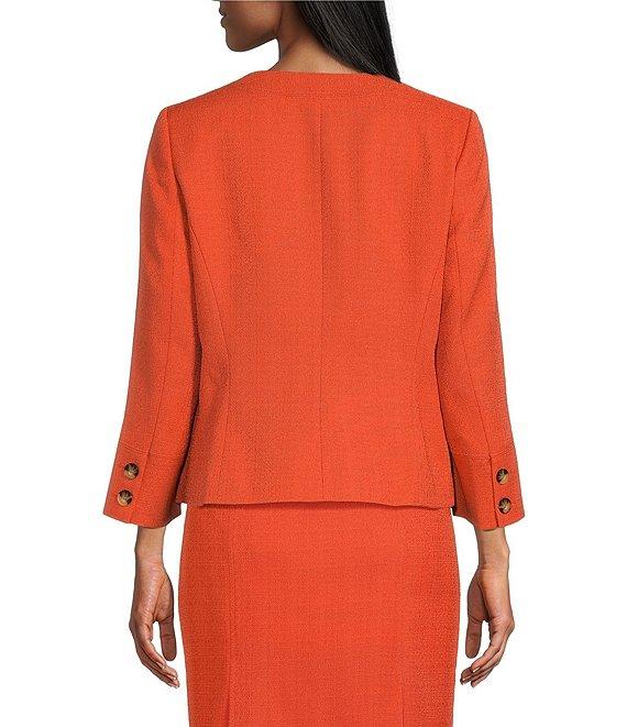 From Kasper, this jacket features: textured fabrication crew neckline 3/4 sleeves two patch pockets with buttons at hips open front, no closure approx. 21.5" length polyester/elastane dry clean Imported.
